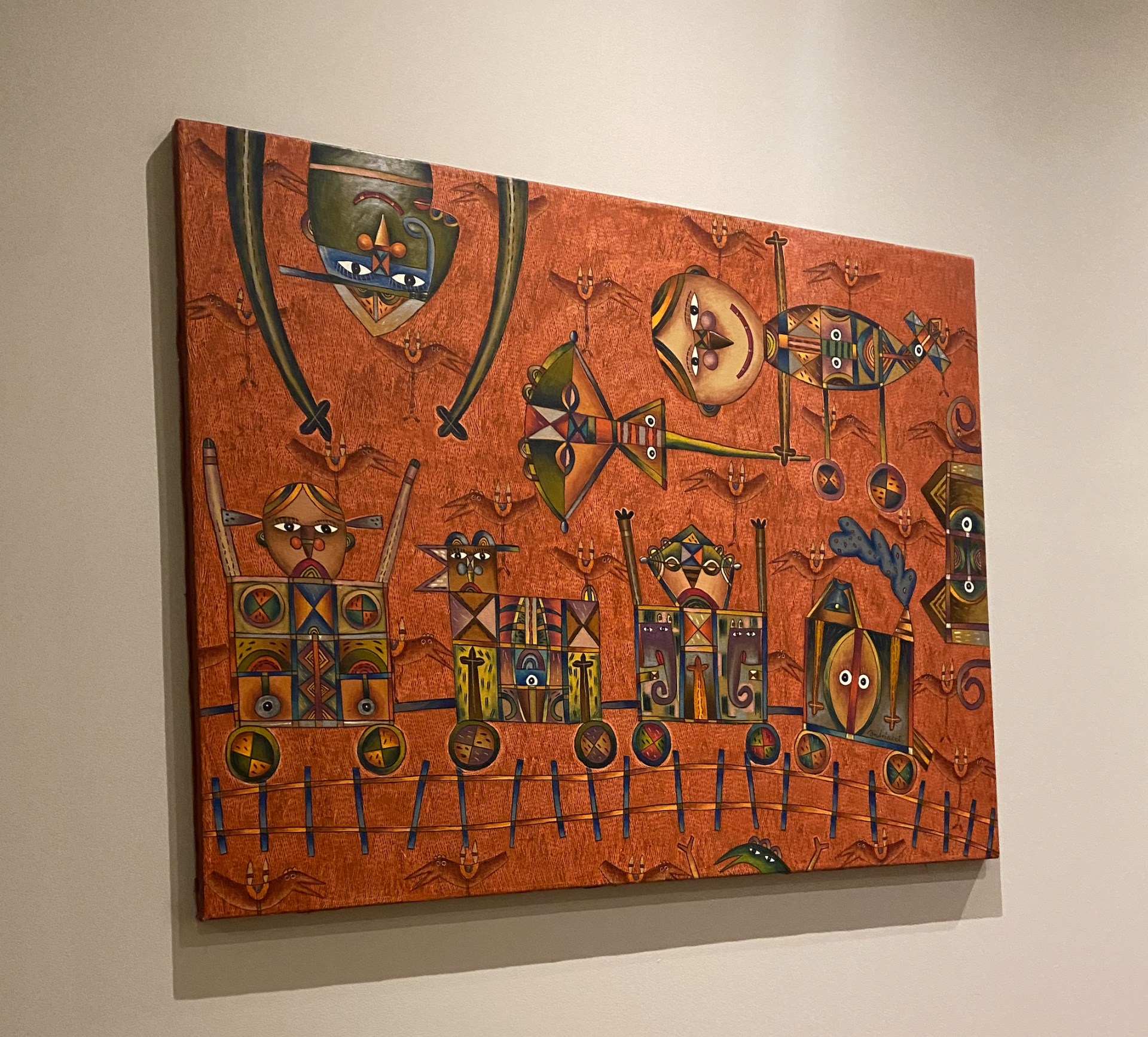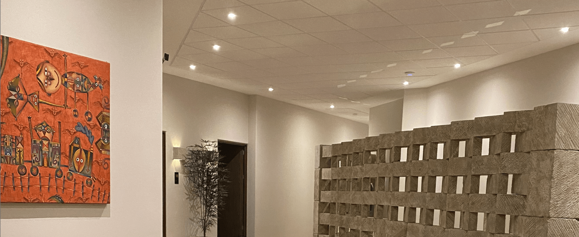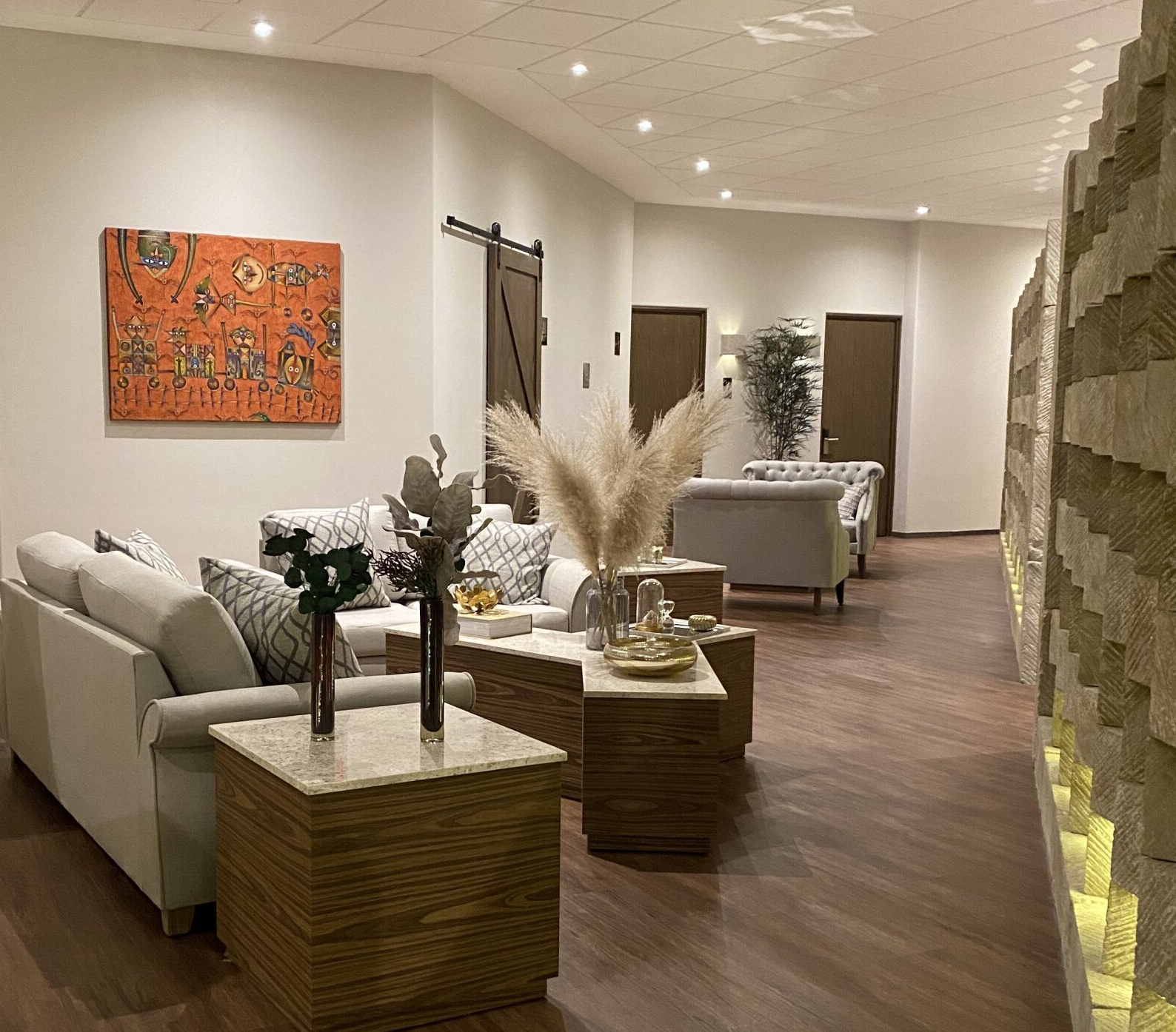 Para realzar el toque elegante de nuestro lobby, contamos con la exposición de una pintura de andriacci, con sus mezcla de tonos alegres predominando el rojo y naranja dándole al espacio vivez.